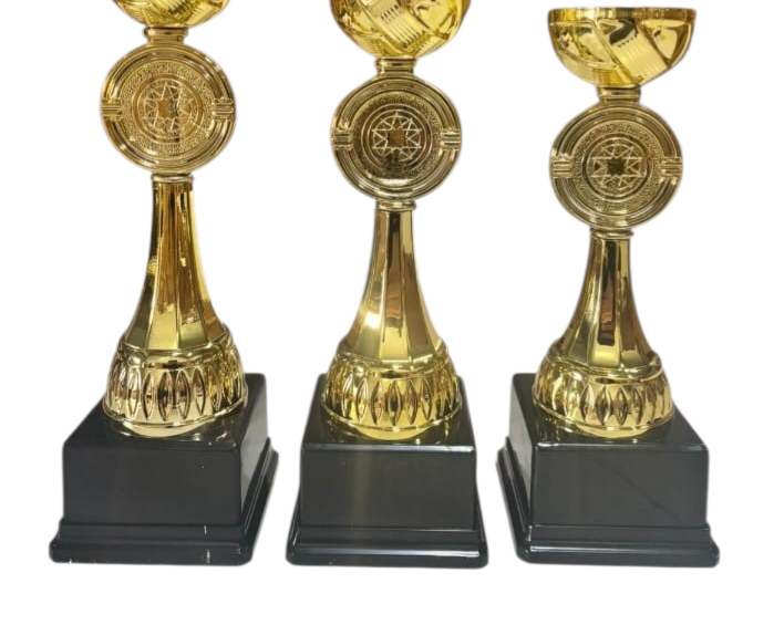 Metal ödül kupaları: Altın, gümüş ve bronz kaplamalı klasik tasarımlar.